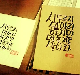 서두르지 말아라 : 붓글씨 캘리 그라피 같이 일하던 동생이 가구공예를 배우고 싶다며 서울로 떠났다. 한 네 살인가 차이가 나던 동생인데 가서도 잘지내라는 마음을 한 껏담아서 한글씨 휘갈 겼다. "서두르지 말아라. 하지만 멈추지도 말아라" 희곡 파우스트로 노년에 겨우 무명생활을 딛고 먹고 살만해졌던 괴테의 명언이다. 자신의 일을 하되 조급하여 망치거나 지치지 말고 그렇다고 나태해져서 손에서 놓지도 말라는 뜻이겠지? 대기만성 캐릭터인 그에게 꼭 어울리는 명언이지만 우리도 한번쯤 생각해봐도 좋을 법한 명언이다. 캘리를 쓰다보면 이렇게 좋은 명언들을 만나게 되어서 즐거웁다. 댓글까진 아녀두 함만 공감 눌러주셔요 힘이됩니다 더보기 이전 1 ··· 19 20 21 22 23 24 25 ··· 69 다음